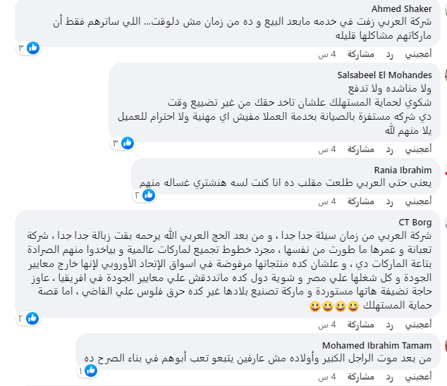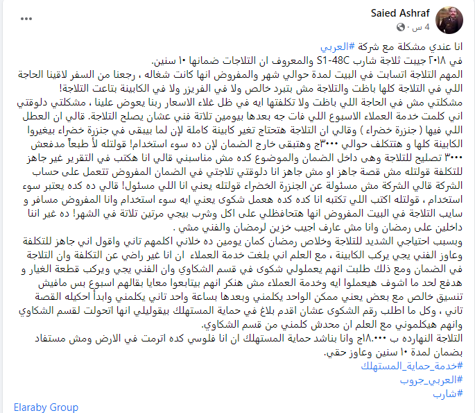 وقال صاحب المشكلة مع شركة العربي،" انا عندي مشكلة مع شركة العربي في 2018 جيبت ثلاجة شارب S1-48C والمعروف ان التلاجات ضمانها 10 سنين. المهم التلاجة اتسابت في البيت لمدة حوالي شهر والمفروض انها كانت شغاله ، رجعنا من السفر لاقينا الحاجة اللي في التلاجة كلها باظت والتلاجة مش بتبرد خالص ولا في الفريزر ولا في الكابينة بتاعت التلاجة! ".