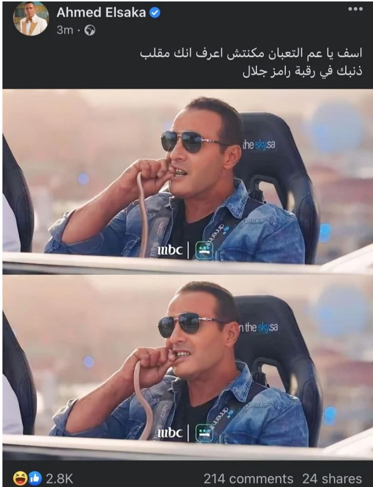 ونشر أحمد السقا صورة له وهو يأكل الثعبان خلال برومو من برنامج رامز نيفر إند، عبر حسابه الشخصي بموقع التواصل الاجتماعي "الفيسبوك"، وعلّق قائلًا:" آسف يا عم التعبان مكنتش أعرف إنك مقلب.. ذنبك في رقبة رامز جلال".