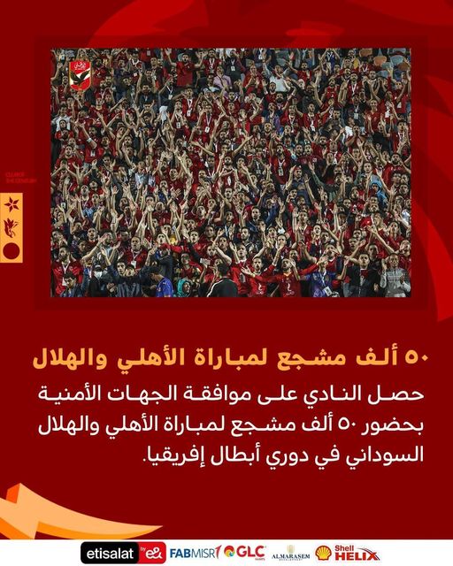 حصل النادي الأهلي على موافقة الجهات الأمنية بحضور 50 ألف مشجع لمباراة الأهلي والهلال السوداني في دوري أبطال إفريقيا.
