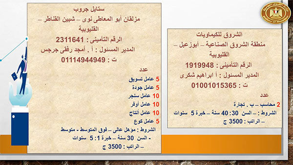 وأضافت أنه يمكن للراغبين فى الحصول على تلك الفرص، التقديم بديوان عام وزارة القوى العاملة وعنوانها 3 شارع يوسف عباس مدينة نصر بالقاهرة، أو بديوان عام مديرية القوى العاملة بالقليوبية وعنواها بنها – كورنيش النيل – مبنى مجمع المصالح الحكومية – خلف ديوان عام المحافظة، كما يمكن الاستفسار عن الوظائف المتوفرة من خلال التواصل مع الأرقام الموضحة فى الكشف المرفق.