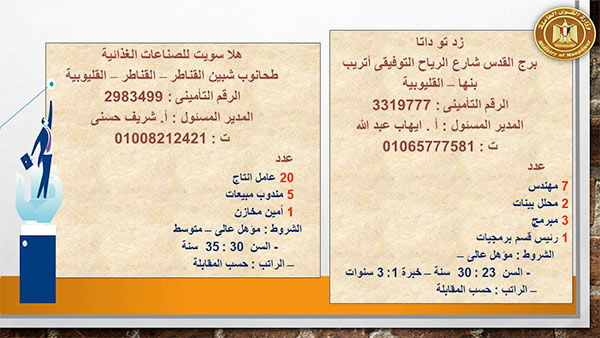 وأوضحت هبة أحمد مدير عام الإدارة العامة للتشغيل بالوزارة، أن الشركات التى وفرت الفرص هى: هلا سويت للصناعات الغذائية، زد تو داتا، الشروق للكيماويات، ستايل جروب، دانتيل سلامتكس، تراست للتصنيع الهندسى ..كما تضمنت الوظائف التى تم توفيرها العديد من التخصصات منها : موظف تكنولوجيا it ، وموظف مبيعات، وفحص منسوجات (إناث)، عمال إنتاج نسيج، مراقبي أمن، وسلامة وصحة مهنية، ومحاسب، ومهندسين، وعمال تسويق وخدمات وجودة، ومحلل بيانات، ومبرمج، ورئيس قسم برمجيات، ومندوب مبيعات، وأمين مخازن.