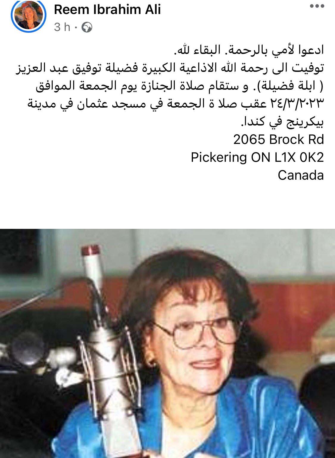 وأضافت: "ستقام صلاة الجنازة يوم الجمعة الموافق 24 مارس، عقب صلاة الجمعة فى مسجد عثمان فى مدينة بيكرينج فى كندا".