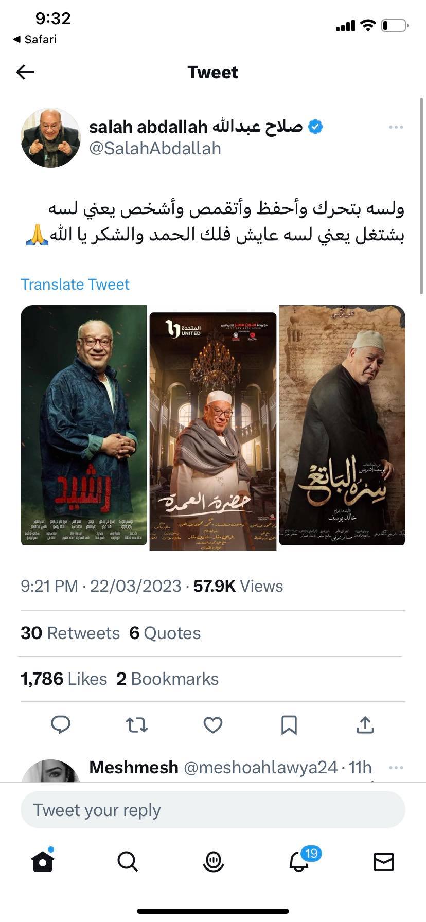 وكتب صلاح عبدالله على موقع التدوينات القصيرة “ تويتر” مغردا : "ولسه بتحرك وأحفظ وأتقمص وأشخص يعني لسه بشتغل يعني لسه عايش فلك الحمد والشكر يا الله".