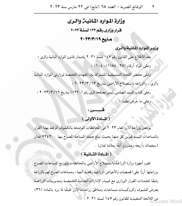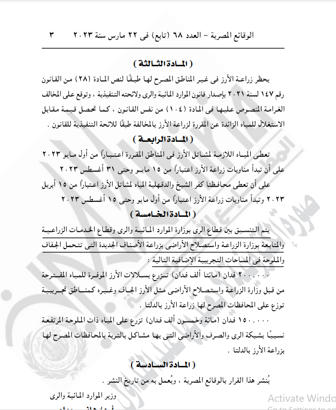 وحظر القرار زراعة الأرز في المناطق غير المصرح لها، وتوقيع غرامات مالية على المخالفين.