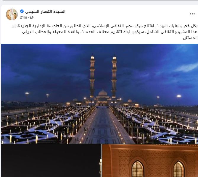 قالت السيدة انتصار السيسى، قرينة رئيس الجمهورية: "بكل فخر واعتزاز، شهدت افتتاح مركز مصر الثقافي الإسلامي، الذي انطلق من العاصمة الإدارية الجديدة.