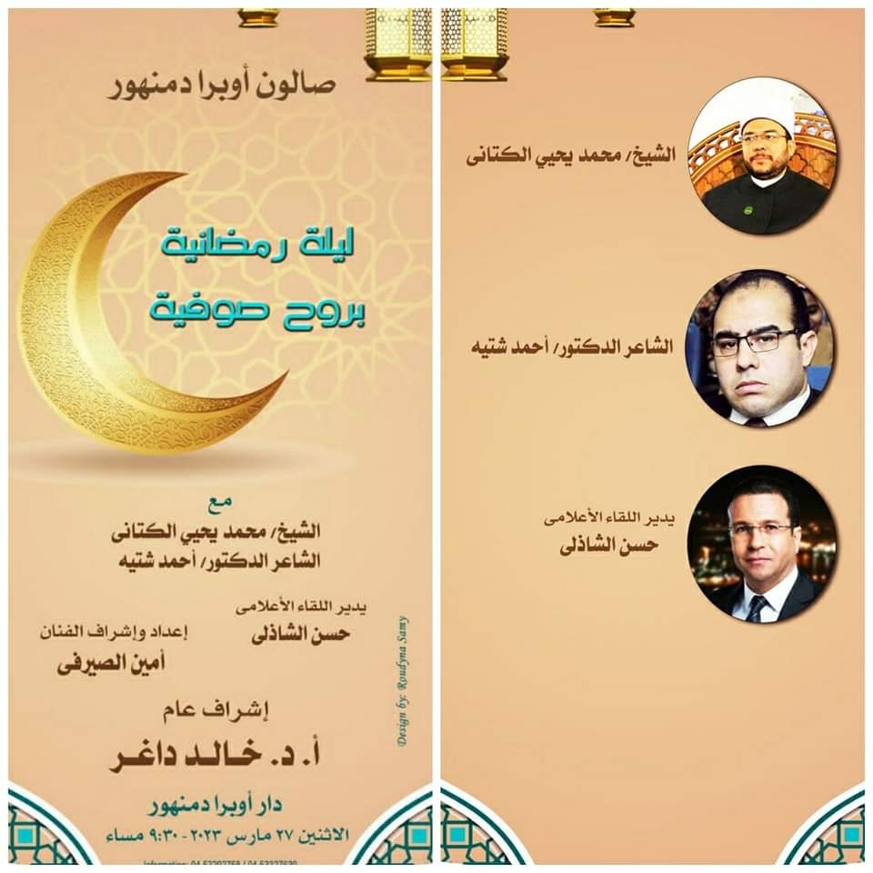 تنظم دار الأوبرا المصرية برئاسة الدكتور خالد داغر صالون ثقافي بعنوان " ليلة رمضانية بروح صوفية" في التاسعة والنصف مساء يوم الإثنين المقبل 27 مارس والموافق اليوم الخامس من شهر رمضان على مسرح أوبرا دمنهور.