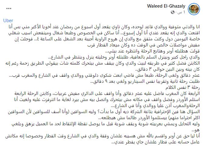 وقال صاحب المشكلة مع أوبر،" انا والدتي متوفية ووالدي قاعد لوحده، وكان ناوي يقعد أول اسبوع من رمضان عند أخويا الأكبر مني بس أنا اقنعت والدي إنه يقعد عندي أنا أول إسبوع... أنا ساكن في الخصوص وطبعا شغال ومينفعش اسيب شغلي خاصة اليومين دول وكنت متفق مع والدي إن هروح الزاوية أجيبة بعد الشغل على الساعة ٤... فوجئت إن مفيش مواصلات خالص في الوقت ده وكان ميعاد الفطار قرب قولت هطلبله أوبر وهتابع الرحلة وانتظره عند بيتي".