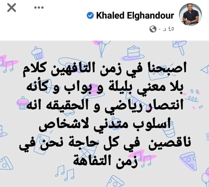 وكتب خالد الغندور، عبر صفحته الشخصية على موقع التواصل الاجتماعي طفيس بوك": "أصبحنا في زمن التافهين كلام بلا معني.. بليلة وبواب.. وكأنه انتصار رياضي والحقيقه انه أسلوب متدني لأشخاص ناقصين في كل حاجة نحن في زمن التفاهة".
