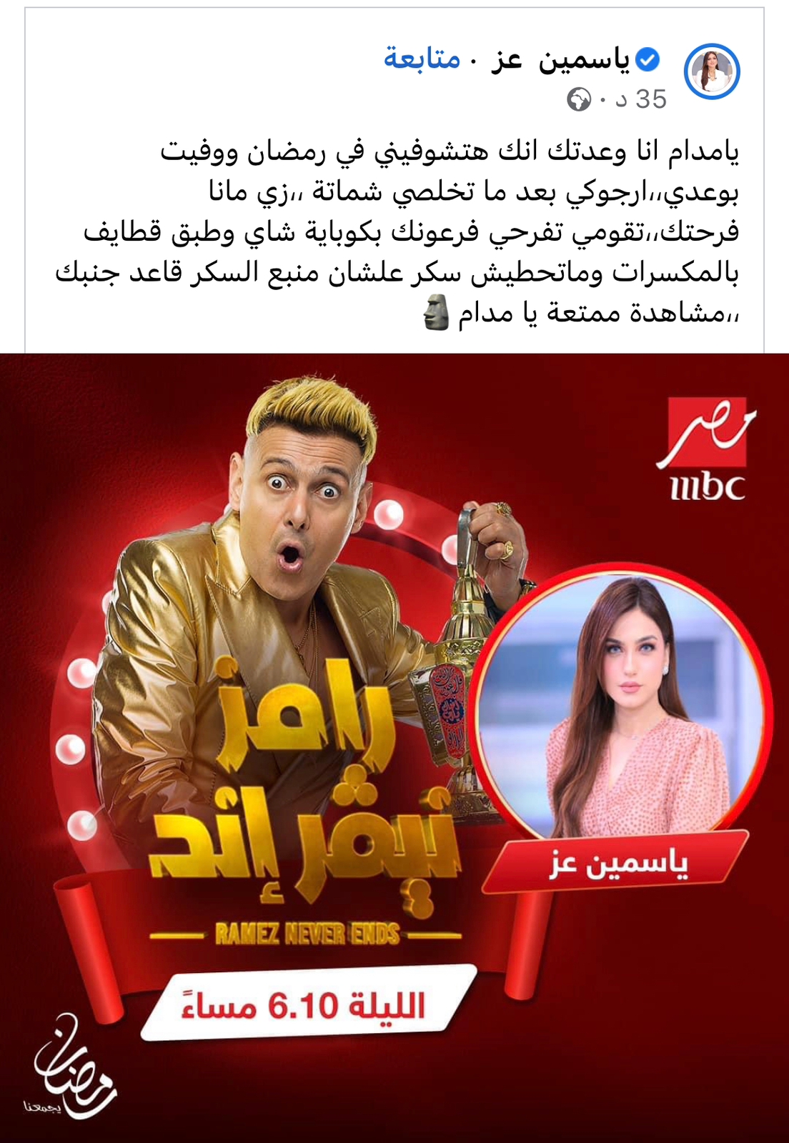 ونشرت ياسمين عز عبر صفحتها على موقع التواصل الإجتماعي “الفيسبوك” قائلة:" يامدام انا وعدتك انك هتشوفيني في رمضان ووفيت بوعدي، ارجوكي بعد ما تخلصي شماتة زي مانا فرحتك تقومي تفرحي فرعونك بكوباية شاي وطبق قطايف بالمكسرات وماتحطيش سكر علشان منبع السكر قاعد جنبك ، مشاهدة ممتعة يا مدام".