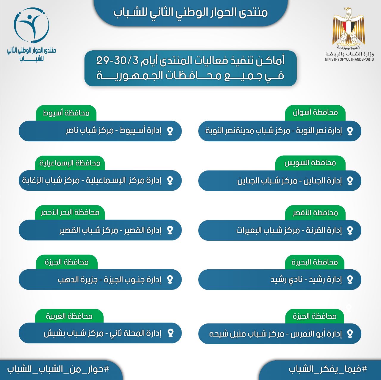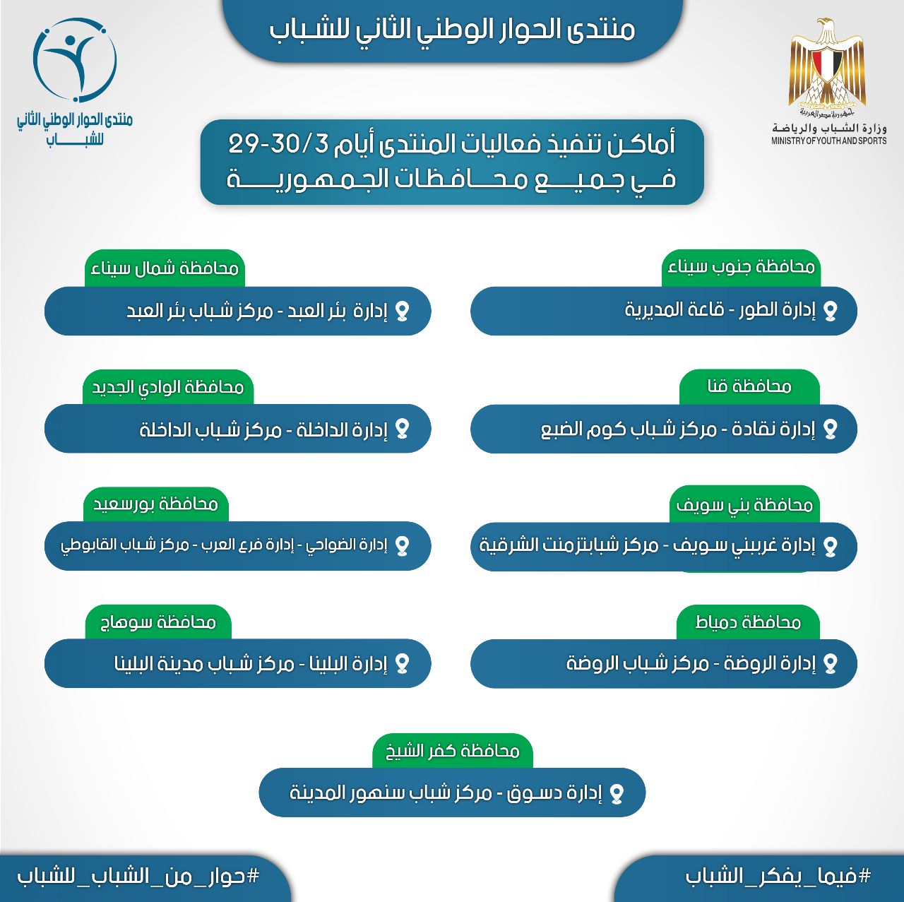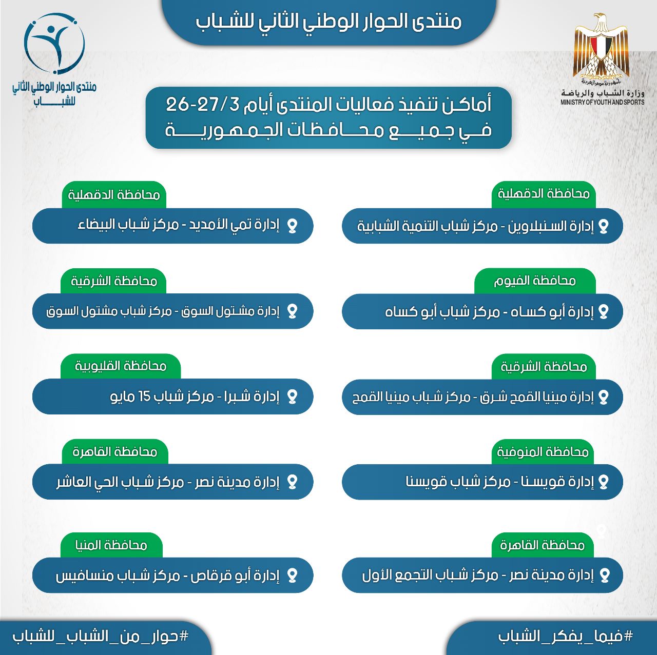 أعلنت وزارة الشباب والرياضة ،من خلال الإدارة المركزية للتعليم المدني، عن أماكن جديدة ضمن فعاليات المرحلة الأولي من مُنتدي الحوار الوطني للشباب في نسخته الثانية، تحت شعار "فيم يفكر الشباب.. حوار من الشباب للشباب"، خلال الفترة من 26 لــ 30 مارس الجاري، بمراكز الشباب الجمهورية ، تحت رعاية الدكتور أشرف صبحي وزير الشباب والرياضة.