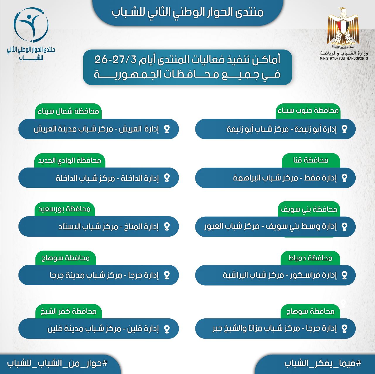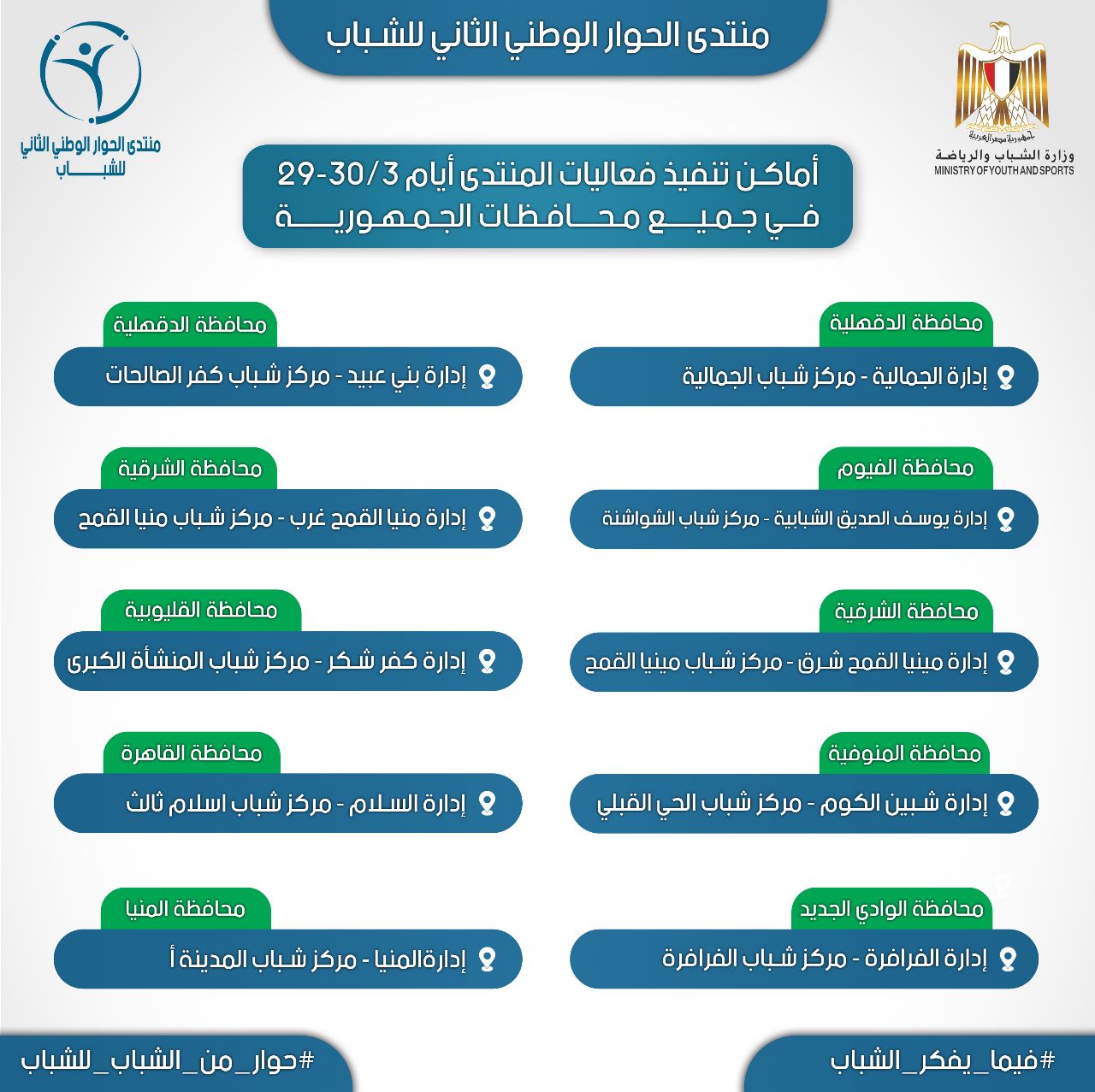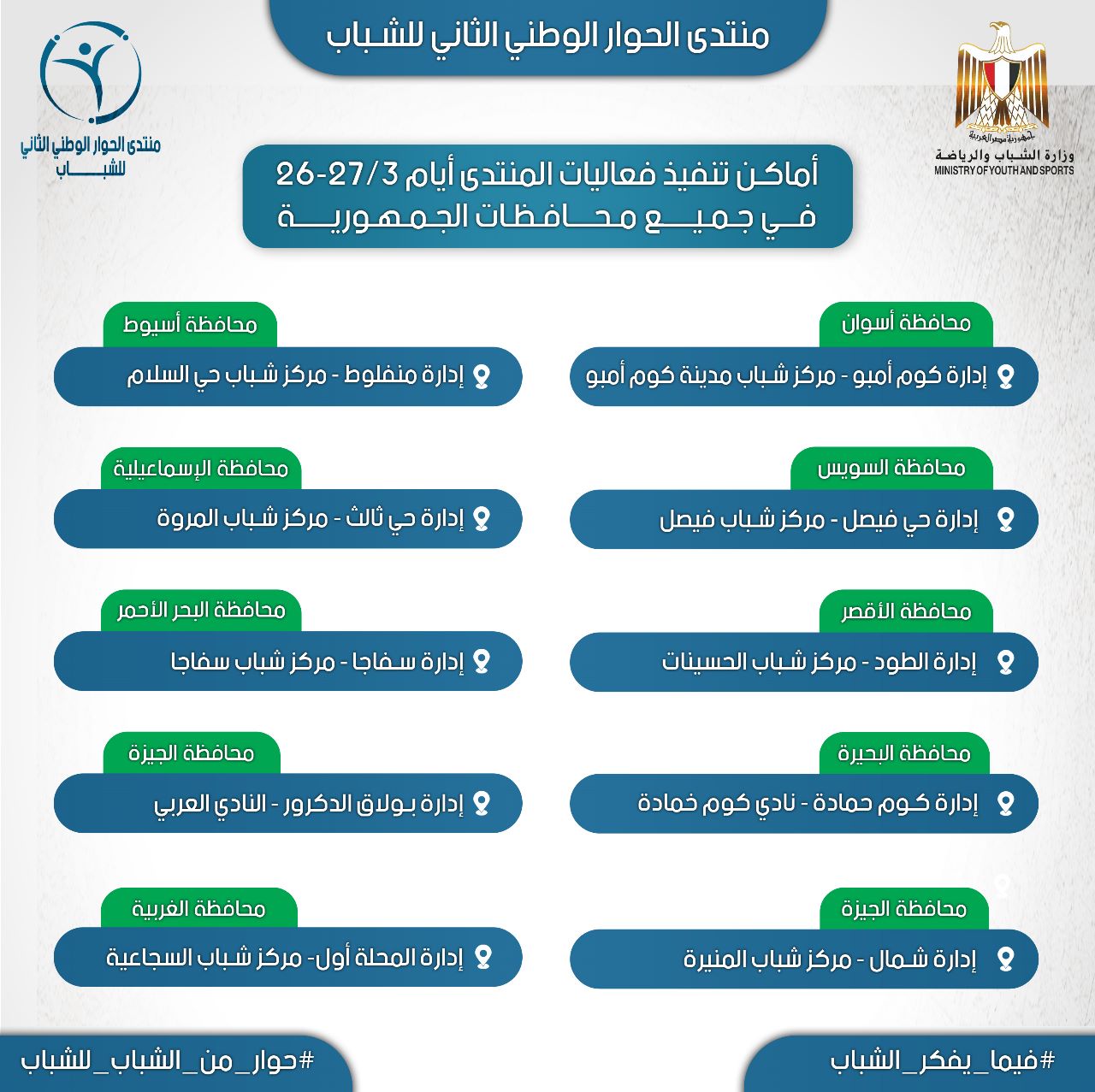 أعلنت وزارة الشباب والرياضة ،من خلال الإدارة المركزية للتعليم المدني، عن أماكن جديدة ضمن فعاليات المرحلة الأولي من مُنتدي الحوار الوطني للشباب في نسخته الثانية، تحت شعار "فيم يفكر الشباب.. حوار من الشباب للشباب"، خلال الفترة من 26 لــ 30 مارس الجاري، بمراكز الشباب الجمهورية ، تحت رعاية الدكتور أشرف صبحي وزير الشباب والرياضة.