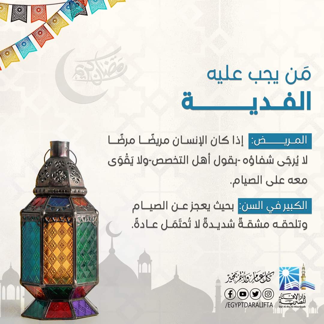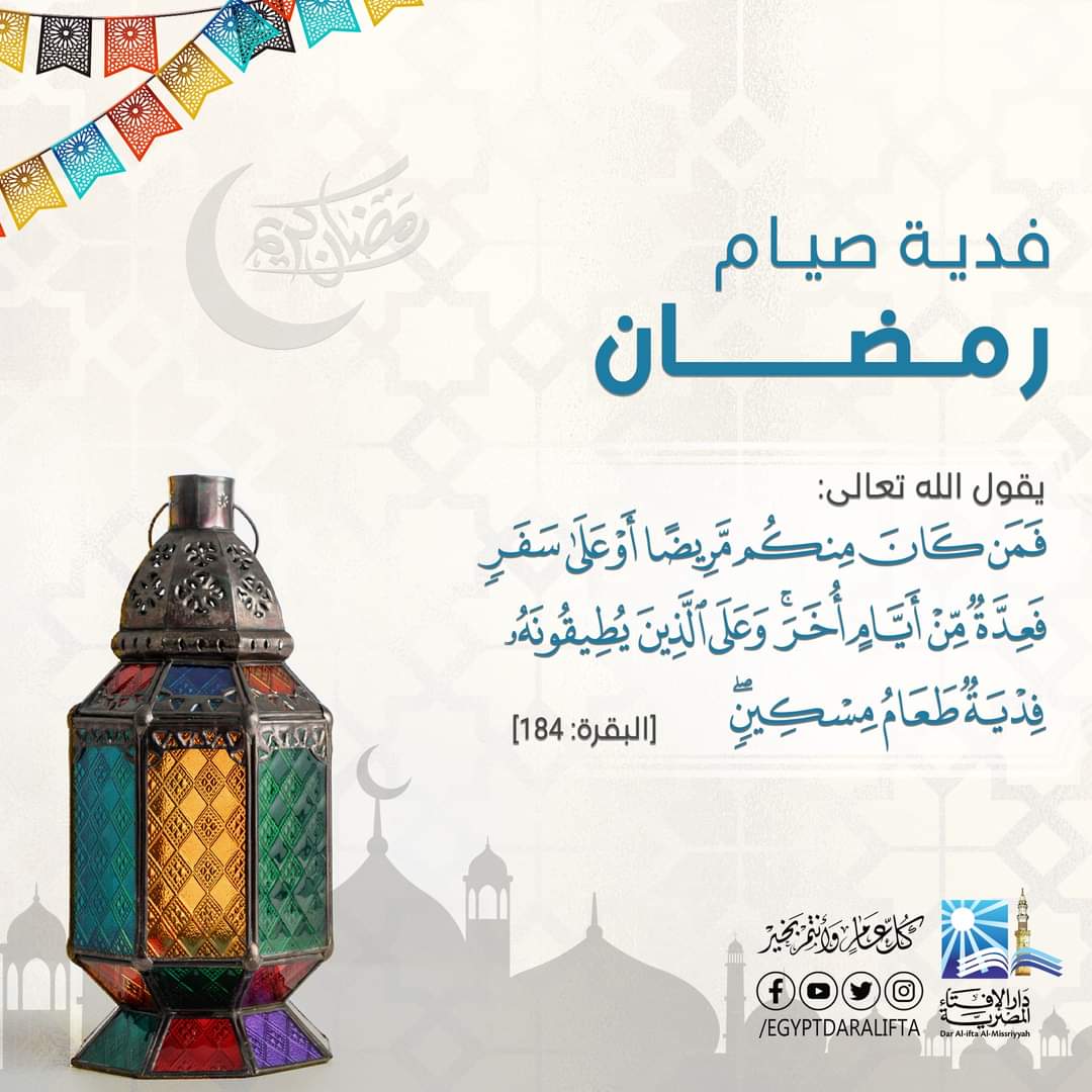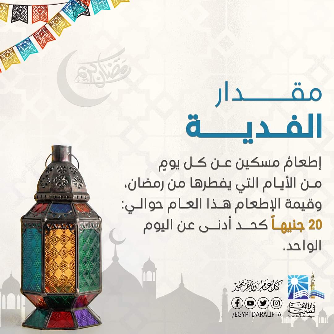 حددت دار الإفتاء المصرية قيمة كفارة الصيام لمن لا يستطيع الصوم بقية حياته بالحد الأدنى 20 جنيها عن اليوم الواحد، مشددة على أن من يستطيع الصوم بعد انقضاء العذر عليه القضاء بعدد الأيام التى أفطرها، سواء كان ذلك لمرض يرجى شفاءه أو لحمل أو رضاعة أو غير ذلك، وبينت الدار الحالات التى يلزم فيها القضاء، مشيرة إلى أن القضاء: هو صيام يوم بدلا عن اليوم الذي أفطر فيه الصائم في نهار رمضان، وأوضحت ذلك من خلال الانفوجراف التالي: