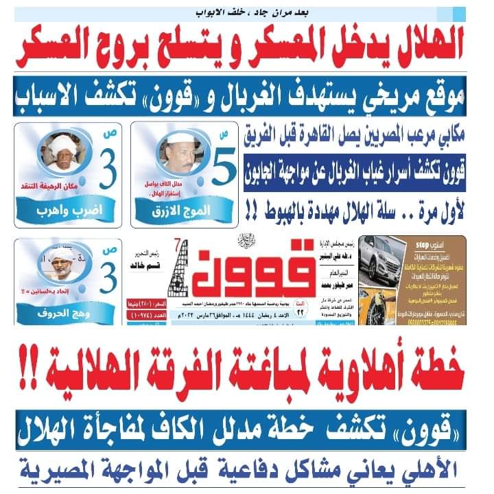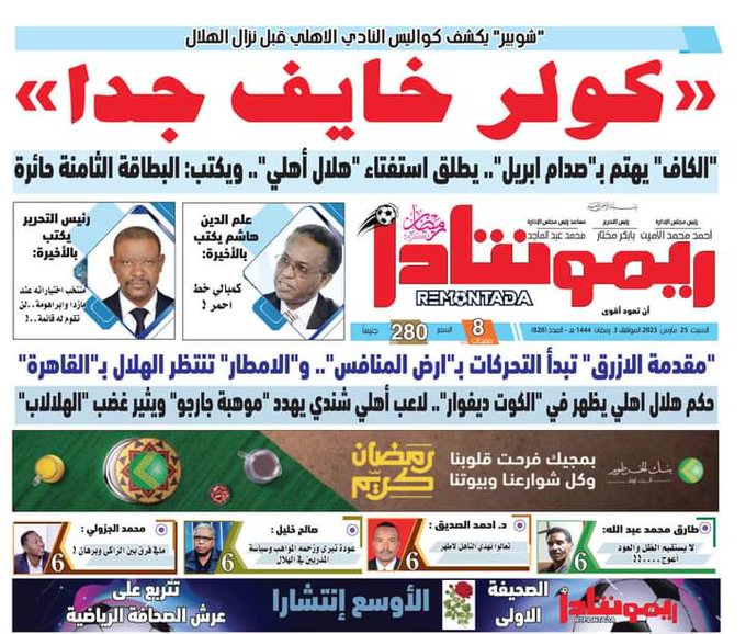 وعنونت صحيفة ريمونتادا "كولر خايف جداً"، وأضافت: الكاف يهتم بـ صدام ابريل.. يطلق استفتاء هلال أهلي.. ويكتب البطاقة الثامنة حائرة، وكتب عنوان آخر، "مقدمة الأزرق" تبدأ التحركات بـ "أرض المنافس".. والأمطار تنتظر الهلال بالقاهرة، وكتبت في صفحة آخر عنوان "الهلال يقاطع الأهلي"