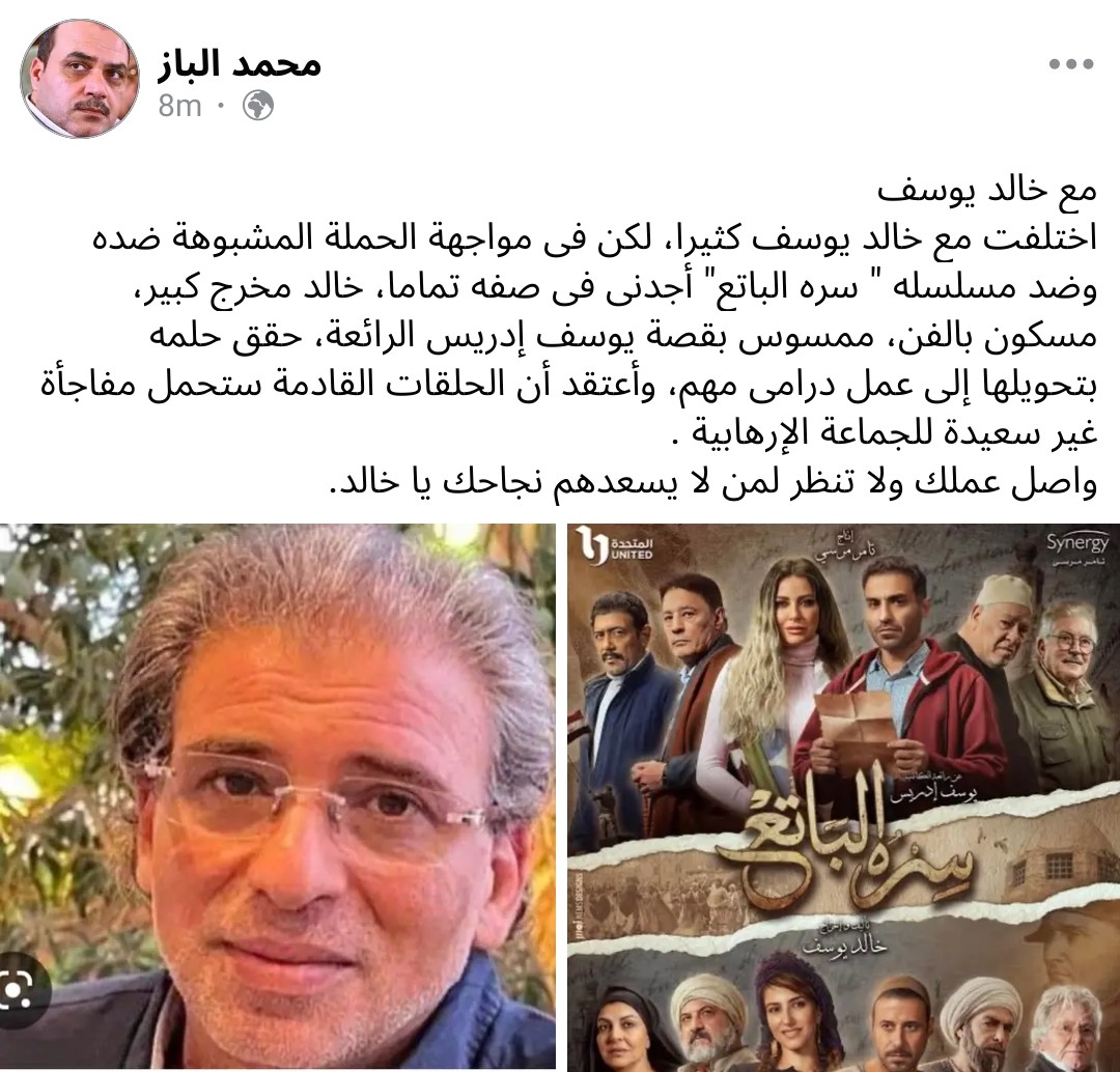 رغم الخلاف بينهما.. "الباز" يدعم خالد يوسف ضد الحملات المشبوهة ضد مسلسل سره الباتع