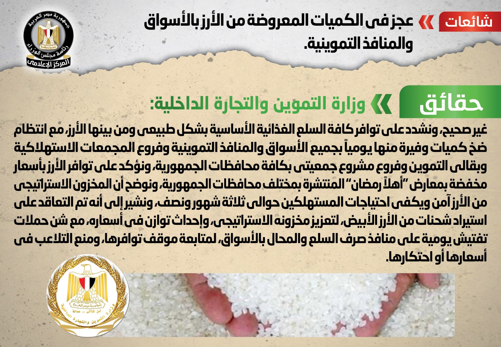 قام المركز الإعلامي لمجلس الوزراء بالتواصل مع وزارة التموين والتجارة الداخلية، والتي نفت تلك الأنباء، مُؤكدةً أنه لا صحة لوجود عجز في الكميات المعروضة من الأرز بالأسواق والمنافذ التموينية، مُشددةً على توافر كافة السلع الغذائية الأساسية بشكل طبيعي ومن بينها الأرز، مع انتظام ضخ كميات وفيرة منها يومياً بجميع الأسواق والمنافذ التموينية وفروع المجمعات الاستهلاكية وبقالي التموين وفروع مشروع جمعيتي بكافة محافظات الجمهورية، مُؤكدةً على توافر الأرز بأسعار مخفضة بمعارض "أهلاً رمضان" المنتشرة بمختلف محافظات الجمهورية، مُوضحةً أن المخزون الاستراتيجي من الأرز آمن و يكفي احتياجات المستهلكين حوالي ثلاثة شهور ونصف، مُشيرةً إلى أنه تم التعاقد على استيراد شحنات من الأرز الأبيض، لتعزيز مخزونه الاستراتيجي، وإحداث توازن في أسعاره، مع شن حملات تفتيش يومية على منافذ صرف السلع والمحال بالأسواق، لمتابعة موقف توافرها، ومنع التلاعب في أسعارها أو احتكارها.