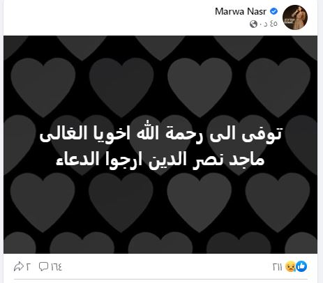 وكتبت مروة نصر، قائلة :"توفى الى رحمة الله اخويا الغالى ماجد نصر الدين، ارجوا الدعاء".