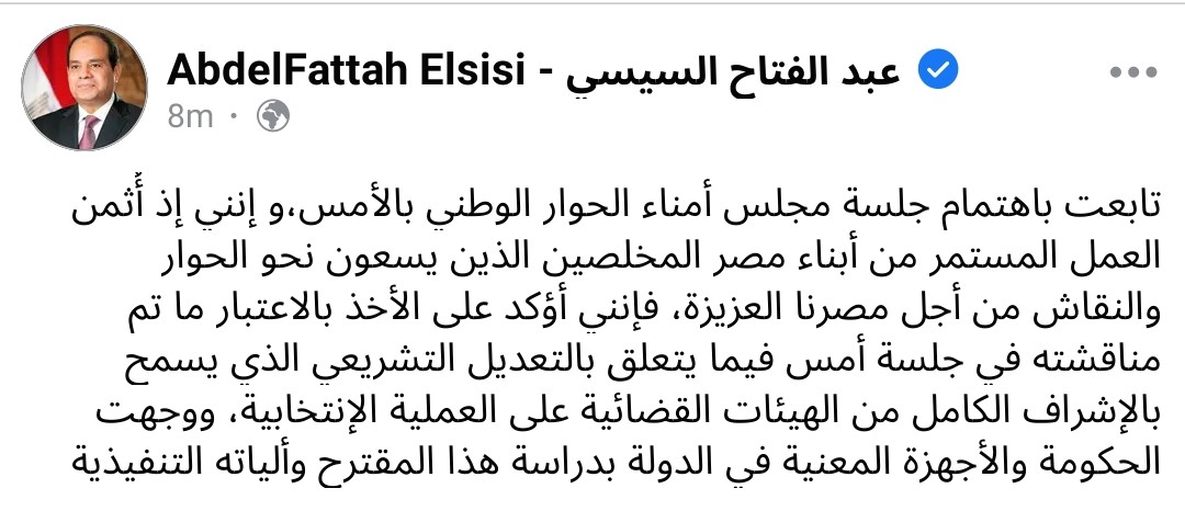 وقال الرئيس عبد الفتاح السيسي عبر حساباته الرسمية بمواقع التواصل الاجتماعى، قائلا: "تابعت باهتمام جلسة مجلس أمناء الحوار الوطني بالأمس، وإنني إذ أُثمن العمل المستمر من أبناء مصر المخلصين الذين يسعون نحو الحوار والنقاش من أجل مصرنا العزيزة، فإنني أؤكد على الأخذ بالاعتبار ما تم مناقشته في جلسة أمس فيما يتعلق بالتعديل التشريعي الذي يسمح بالإشراف الكامل من الهيئات القضائية على العملية الإنتخابية، ووجهت الحكومة والأجهزة المعنية في الدولة بدراسة هذا المقترح وألياته التنفيذية".
