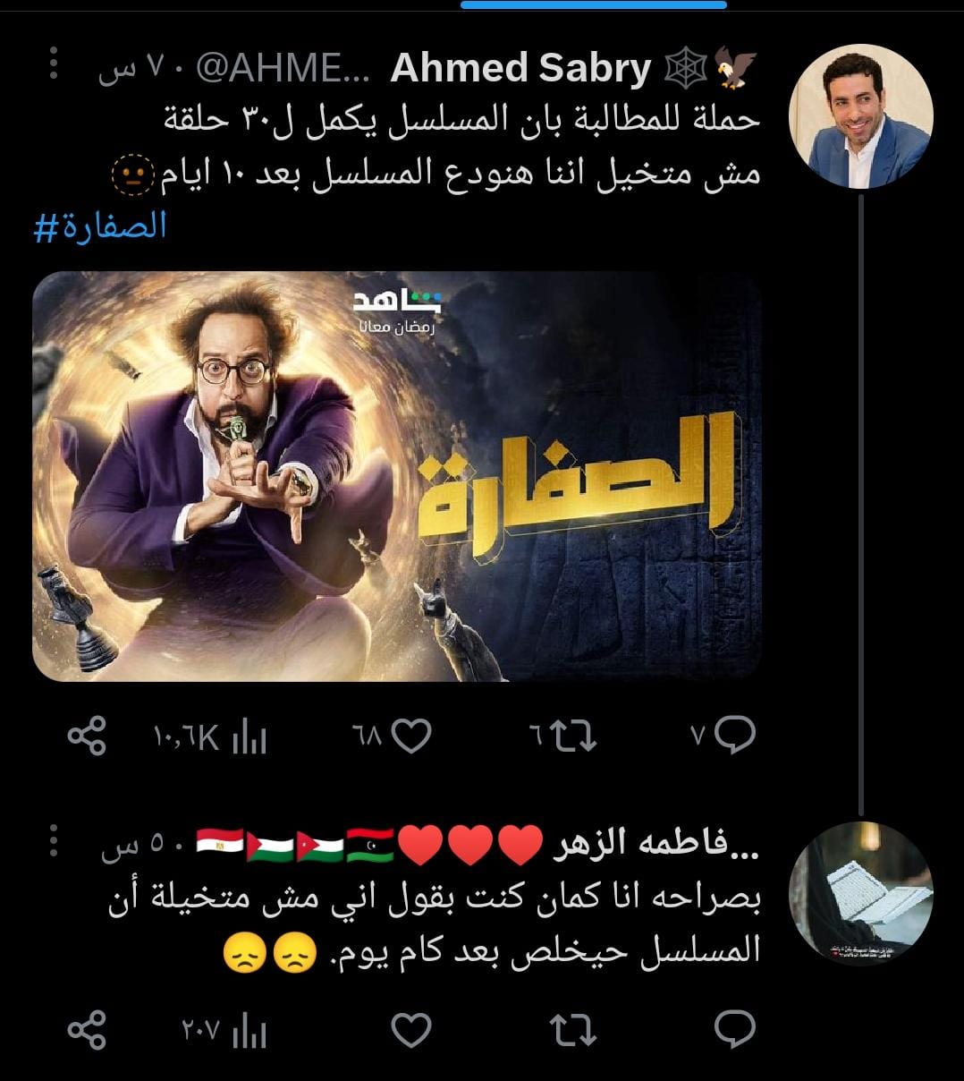 وذلك عبر موقع التغريدات القصيرة "تويتر" والتي جاءت أبرز تعليقاتهم كالتالي: "حملة للمطالبة بإن المسلسل يكمل لـ 30 حلقة مش متخيل إننا هنودع المسلسل بعد 10 أيام".