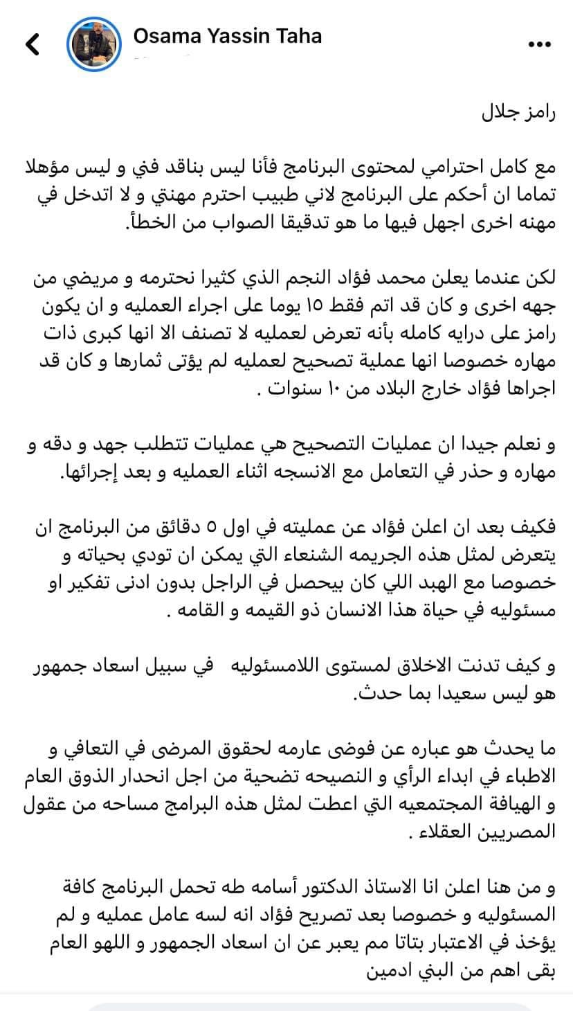 وأكمل أسامة طه، قائلًا :"ما يحدث هو عباره عن فوضى عارمه لحقوق المرضى في التعافي و الاطباء في ابداء الرأي و النصيحه تضحية من اجل انحدار الذوق العام و الهيافة المجتمعيه التي اعطت لمثل هذه البرامج مساحه من عقول المصريين العقلاء" .