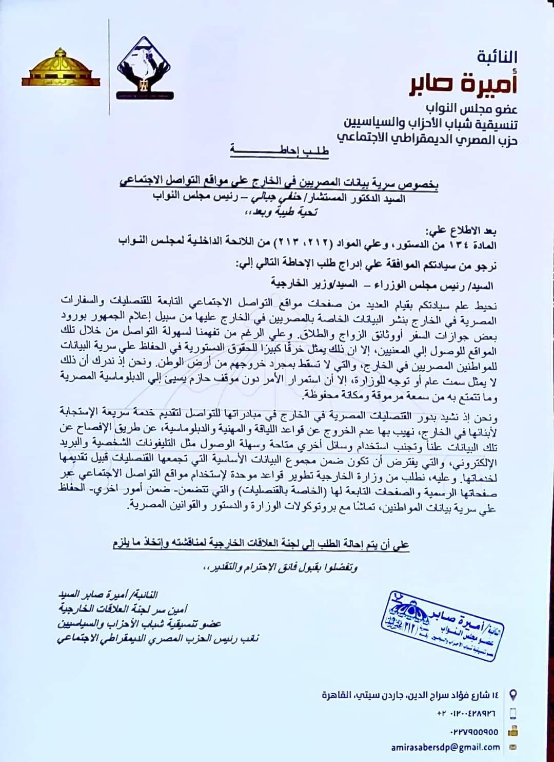 تقدمت النائبة أميرة صابر، أمير سر لجنة العلاقات الخارجية بالنواب ونائب رئيس الحزب المصري الديمقراطي الاجتماعي وعضو تنسيقية شباب الأحزاب والسياسيين بطلب إحاطة موجه لكل من رئيس مجلس الوزراء ووزير الخارجية بشأن قيام العديد من صفحات مواقع التواصل الاجتماعي التابعة للقنصليات والسفارات المصرية بنشر البيانات الخاصة بالمصريين في الخارج لإعلام الجمهور بورود بعض جوازات السفر أو وثائق الزواج والطلاق.