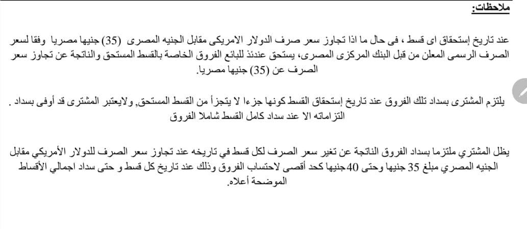 كما تضمنت الشروط الملزمة في العقد الجديد المنسوب لشركة إعمار، أن يظل المشتري ملتزما بسداد الفروق الناتجة عن تغير سعر الصرف لكل قسط في تاريخه عند تجاوز سعر الصرف للدولار الأمريكي مقابل الجنيه المصري مبلغ 35 جنيها وحتى 40 جنيها كحد أقصى لاحتساب الفروق، وذلك عند تاريخ كل قسط وحتی سداد إجمالي الأقساط.