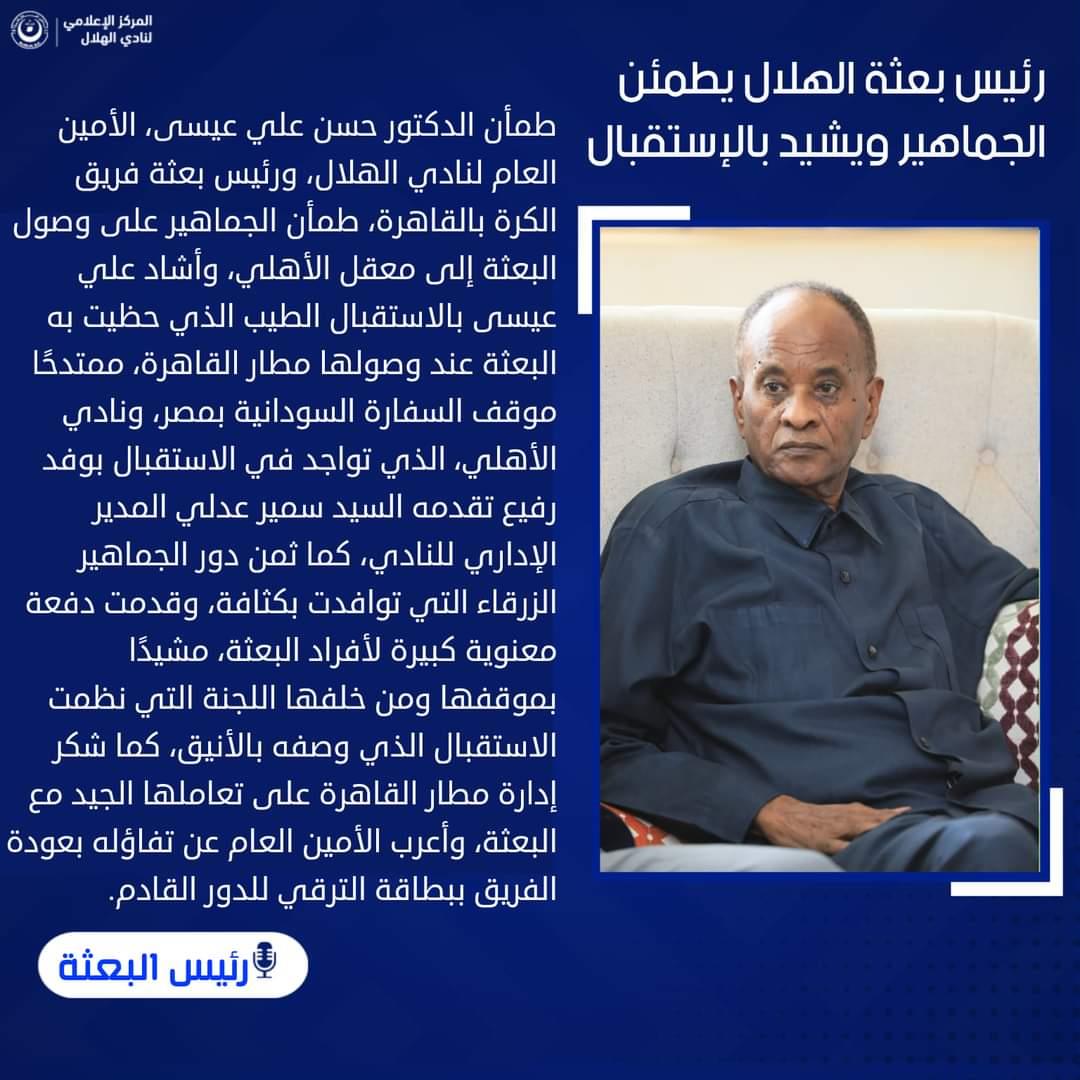 أشاد الدكتور حسن علي عيسى، الأمين العام لنادي الهلال، ورئيس بعثة فريق الكرة بالقاهرة، بالاستقبال الطيب الذي حظيت به البعثة عند وصولها مطار القاهرة، استعدادا لمواجهة الأهلي بدوري أبطال أفريقيا.
