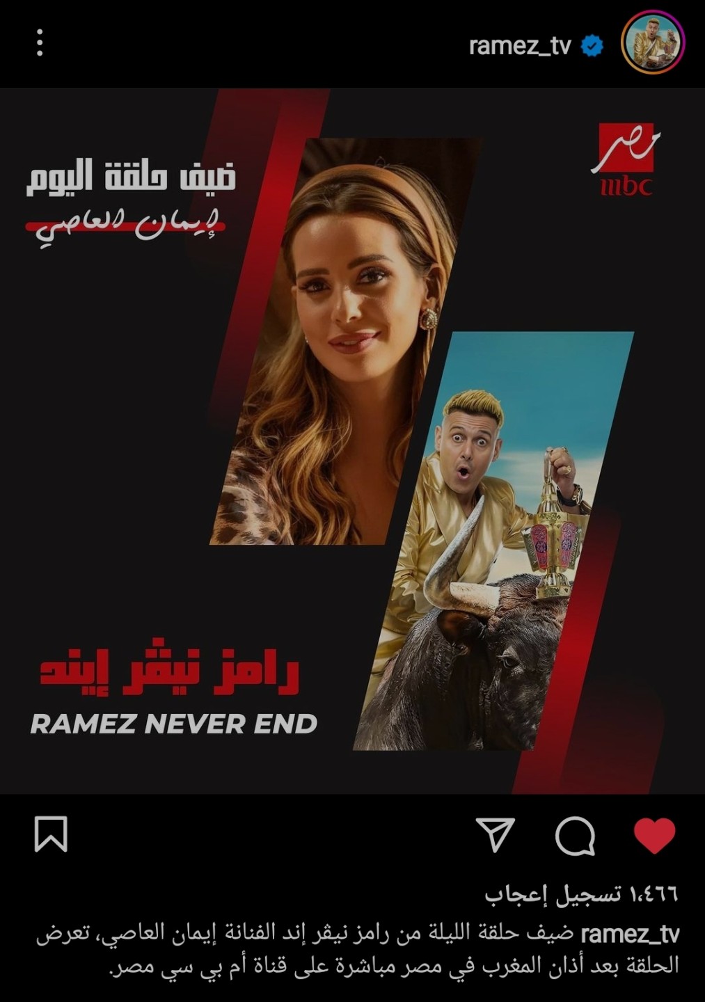 ونشر رامز جلال عبر موقع تبادل الصور والفيديوهات "إنستجرام"، بوستر الحلقة وعلق عليها قائلا: "ضيف حلقة الليلة من رامز نيفر إند الفنانة إيمان العاصي، تعرض الحلقة بعد آذان المغرب في مصر مباشرة على قناة إم بي سي مصر".