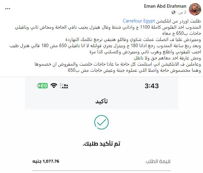وقالت صاحبة الشكوي،" طلبت اوردر من ابلكيشن Carrefour Egypt المندوب اخد الفلوس كاملة 1100ج واداني شنط وقال هينزل يجيب باقي الحاجة ومجاش تاني وباقيلي حاجات ب650 ج معاه ومبيردش عليا ف اتصلت عملت شكوي وقاللو هنبقي نرجع نكلمك النهاردة".