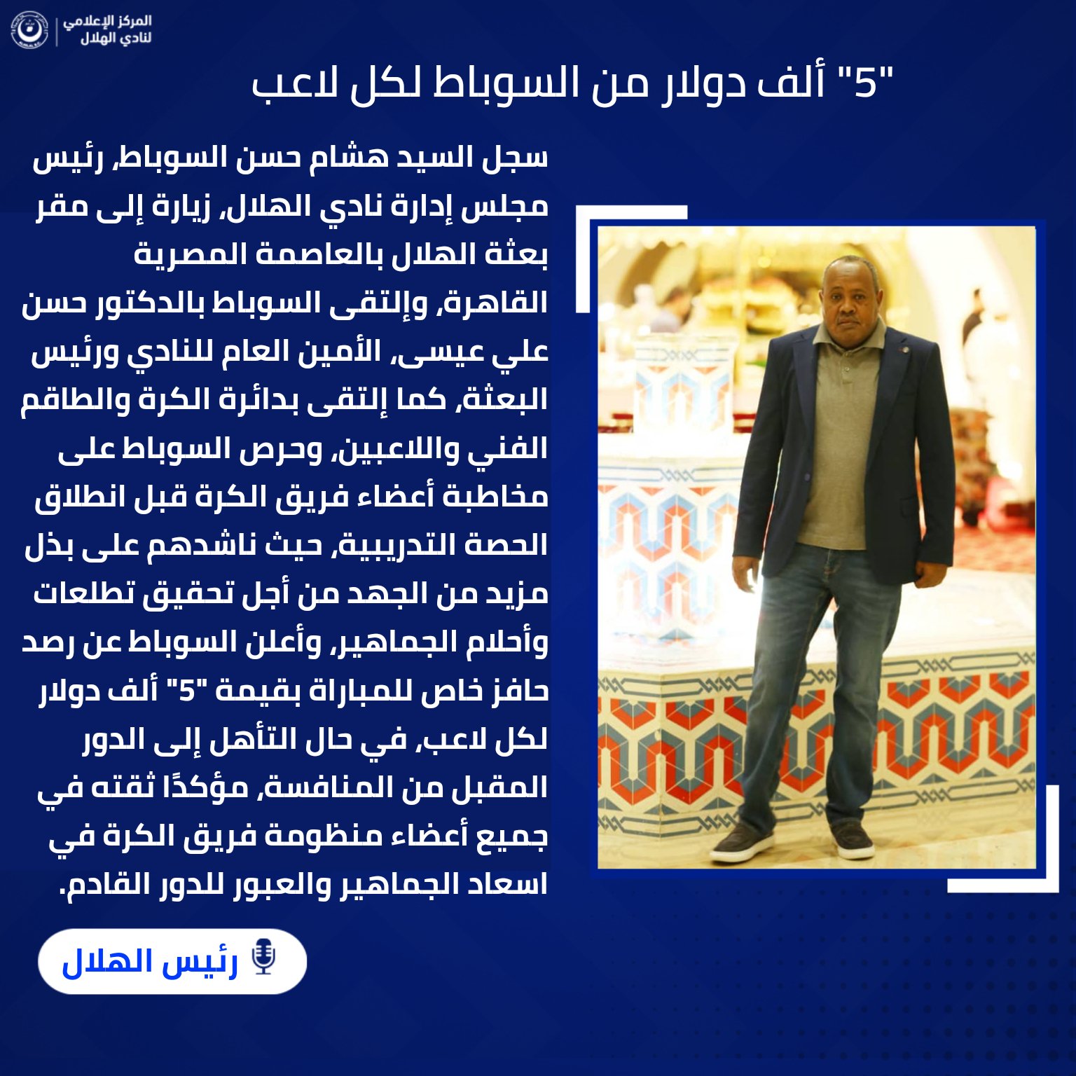 أصدر نادي الهلال السوداني بيان بشأن رصد مكافات مالية للاعبين قيمة 5 الأف دولار لكل في حالة الفوز على الأهلى في دوري أبطال أفريقيا.