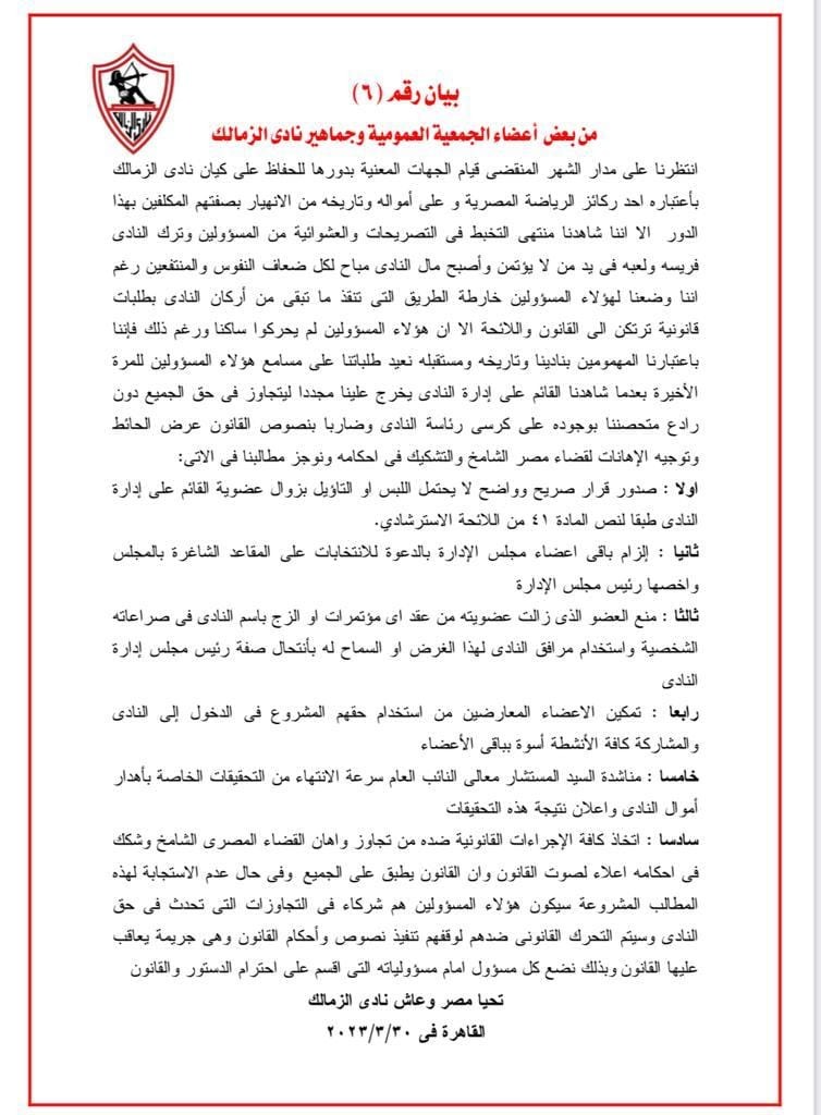 ونشرت مجموعة من أعضاء الجمعية العمومية لنادي الزمالك بيانا، هاجمت فيه مرتضى منصور، رئيس النادي، والمطالبة بعزله من منصبه.
