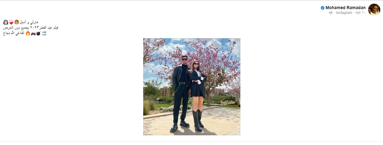 ونشر محمد رمضان صورة تجمه بالفنانة مس عمر عبر صفحته على موقع التواصل الإجتماعي “الفيسبوك” وعلق عليها قائلا:" هارلي وأسيل فيلم عبد الفطر 2023 بجميع دور العرض ثقة في الله نجاح ".