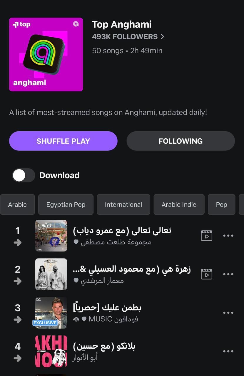 تصدر الفنان عمرو دياب قائمة الأغاني الاعلى استماعا عبر تطبيق أنغامي بأغنيته "تعالى" والتي قدمها في إحدى الحملات الإعلانية الرمضانية.