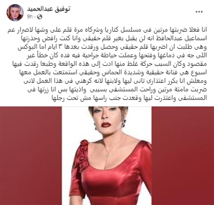 وتابع توفيق عبد الحميد: أما البوكس اللى جه فى دماغها وفتحها وعملت خياطة جراحية فيه فده كان خطأ غير مقصود وكان السبب حركة غلط منها أدت إلى هذه الواقعة وطبعا رقدت فيها أسبوع هى فنانة حقيقية وشديدة الحماس وحقيقي استمتعت بالعمل معها ومعلش أنا بكرر اعتذارى تانى ليها ولابنها لأنه كرهني في هذا العمل لأني ضربت مامتة مرتين وراحت المستشفى بسببي وأذيتها بس أنا زرتها في المستشفى واعتذرت ليها وقعدت جنب راسها مش تحت رجلها.