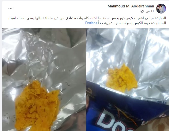 عثرت سيدة على حشرات " نمل" داخل كيس دوريتوس ، محذره من المنتج وضرورة النظر إليه قبل تناوله، وقال زوج صاحبة الواقعة " النهارده مراتي اشترت كيس دوريتوس وبعد ما اكلت كام واحده عادي من غير ما تاخد بالها يعني بصت لقيت المنظر ده جوه الكيس بصراحه حاجه غريبه جدأ".