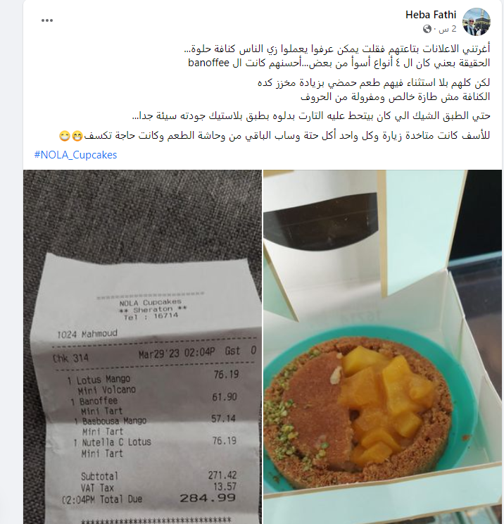 وقالت صاحبة الشكوي عن حلويات نولا،" أغرتني الاعلانات بتاعتهم فقلت يمكن عرفوا يعملوا زي الناس كنافة حلوة...الحقيقة بعني كان ال 4 أنواع أسوأ من بعض...أحسنهم كانت ال banoffee لكن كلهم بلا استثناء فيهم طعم حمضي بزيادة مخزز كده الكنافة مش طازة خالص ومفرولة من الحروف حتي الطبق الشيك الي كان بيتحط عليه التارت بدلوه بطبق بلاستيك جودته سيئة جدا...للأسف كانت متاخدة زيارة وكل واحد أكل حتة وساب الباقي من وحاشة الطعم وكانت حاجة تكسف".