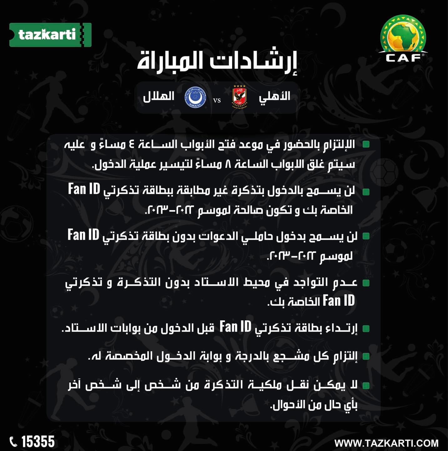 دوري أبطال أفريقيا.. أعلنت شركة تذكرتي عدد من الإرشادات الخاصة بمباراة الأهلي والهلال السوداني المقرر لها التاسعة مساء غدًا السبت في الجولة السادسة لدور المجموعات بدوري أبطال أفريقيا تيسيراً على الجماهير :