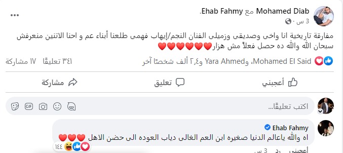 وكتب دياب، قائلًا :"مفارقة تاريخية أنا وأخى وصديقي وزميلى الفنان النجم إيهاب فهمي، طلعنا أبناء عم واحنا الاتنين منعرفش سبحان الله والله ده حصل فعلًا مش هزار".