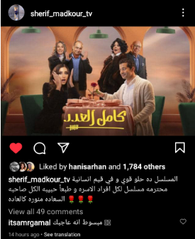 ونشر شريف مدكور صورة البوستر الخاص بالمسلسل عبر صفحته على موقع تبادل التواصل الإجتماعي “الفيسبوك” علق قائلا:" المسلسل دا حلو أوى وفيه قيم إنسانية، محترمة لكل أفراد الأسرة، وطبعًا حبيبة الكل صاحبة السعادة منورة كالعادة".