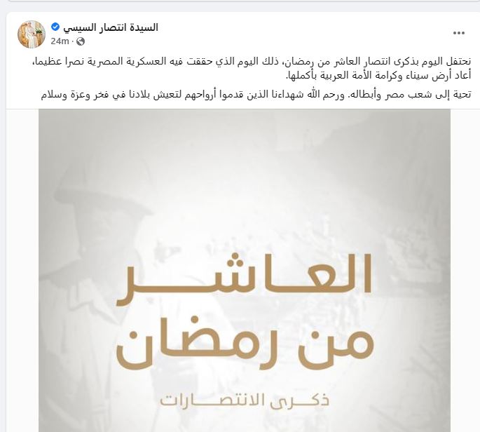 قالت السيدة انتصار السيسي، قرينة الرئيس عبد الفتاح السيسي: نحتفل اليوم بذكرى انتصار العاشر من رمضان، ذلك اليوم الذي حققت فيه العسكرية المصرية نصرا عظيما، أعاد أرض سيناء وكرامة الأمة العربية بأكملها.