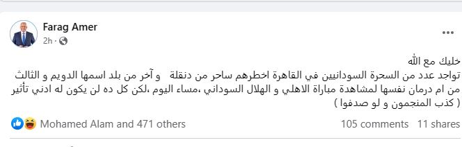 وكتب فرج عامر عبر صفحته الرسمية بموقع "فيس بوك"، "خليك مع الله.. تواجد عدد من السحرة السودانيين في القاهرة اخطرهم ساحر من دنقلة وأخر من بلد اسمها الدويم والثالث من ام درمان نفسها لمشاهدة مباراة الاهلي و الهلال السوداني ،مساء اليوم ،لكن كل ده لن يكون له ادني تأثير ( كذب المنجمون و لو صدقوا)".