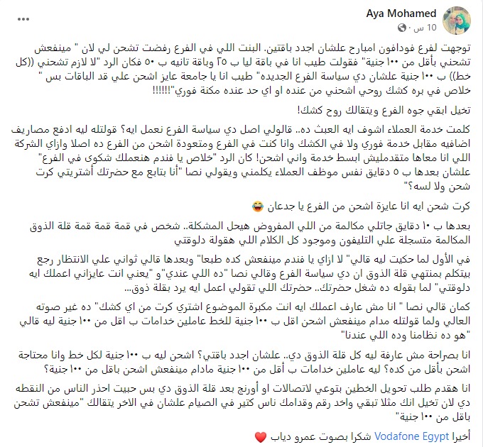 وتابعت عن مشكلتها مع شركة فودافون،" انا هقدم طلب تحويل الخطين بتوعي لاتصالات او أورنج بعد قلة الذوق دي بس حبيت احذر الناس من النقطه دي لان تخيل انك مثلا تبقي واخد رقم وقدامك ناس كتير في الصيام علشان في الاخر يتقالك "مينفعش تشحن باقل من 100 جنية"