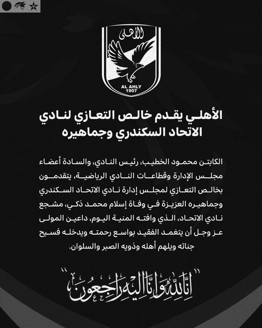 الاتحاد السكندري.. تقدم مجلس ادارة النادي الأهلى برئاسة الكابتن محمود الخطيب خالص التعازي لنادي الاتحاد السكندري وجماهيره لوفاة اسلام محمد زكي مشجع الاتحاد السكندري الذي وافته المانية صباح اليوم بسبب حادثة صالة الدكتور حسن مصطفي.
