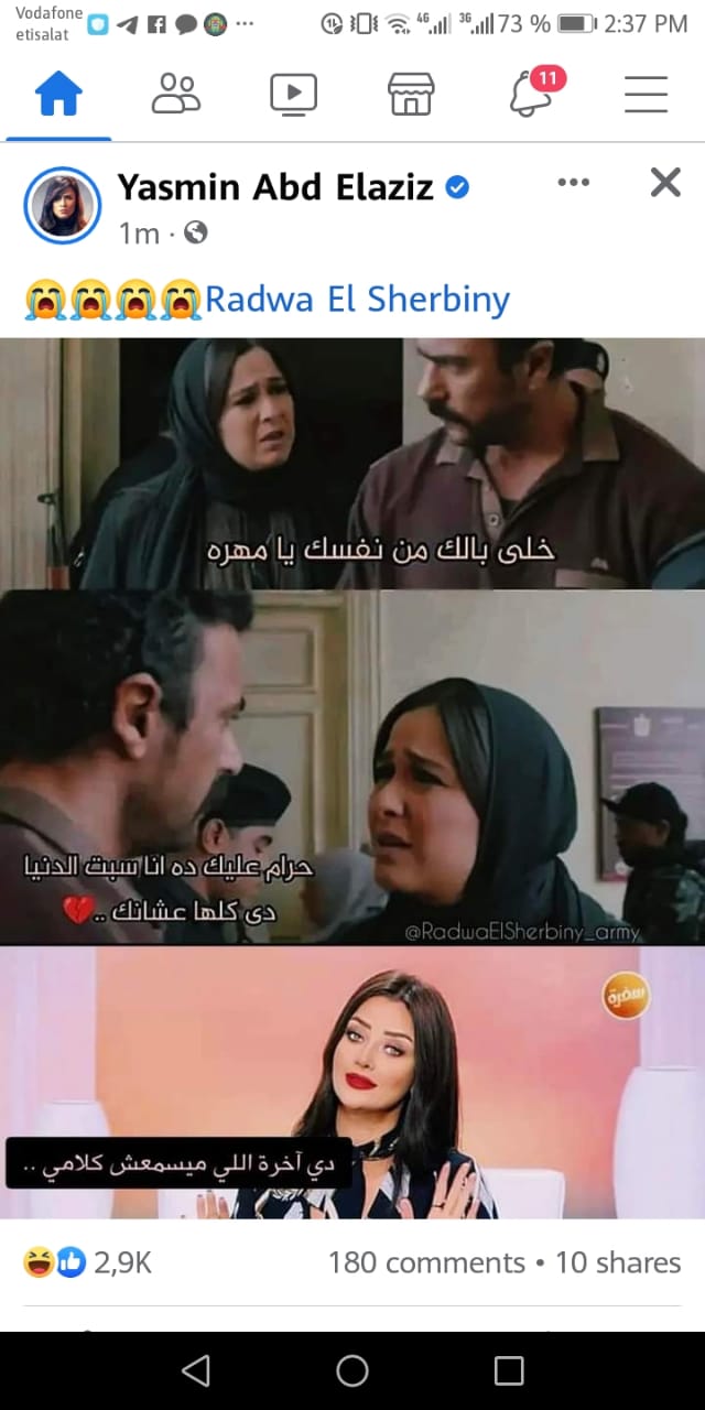 ويقول أحمد العوضي في المشهد “خلي بالك من نفسك يا مهرة”، لترد عليه ياسمين عبد العزيز في المشهد: “حرام عليك دا أنا سيبت كل الدنيا علشانك”، وتظهر رضوى الشربيني في نهاية الصورة بكوميكس مكتوب فيها: “دي آخرة اللي ميسمعش كلامي”.