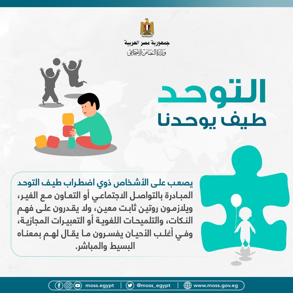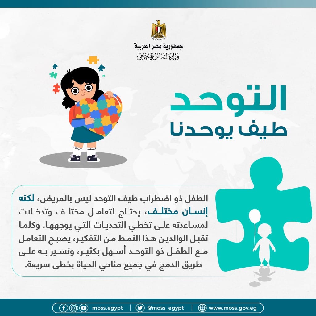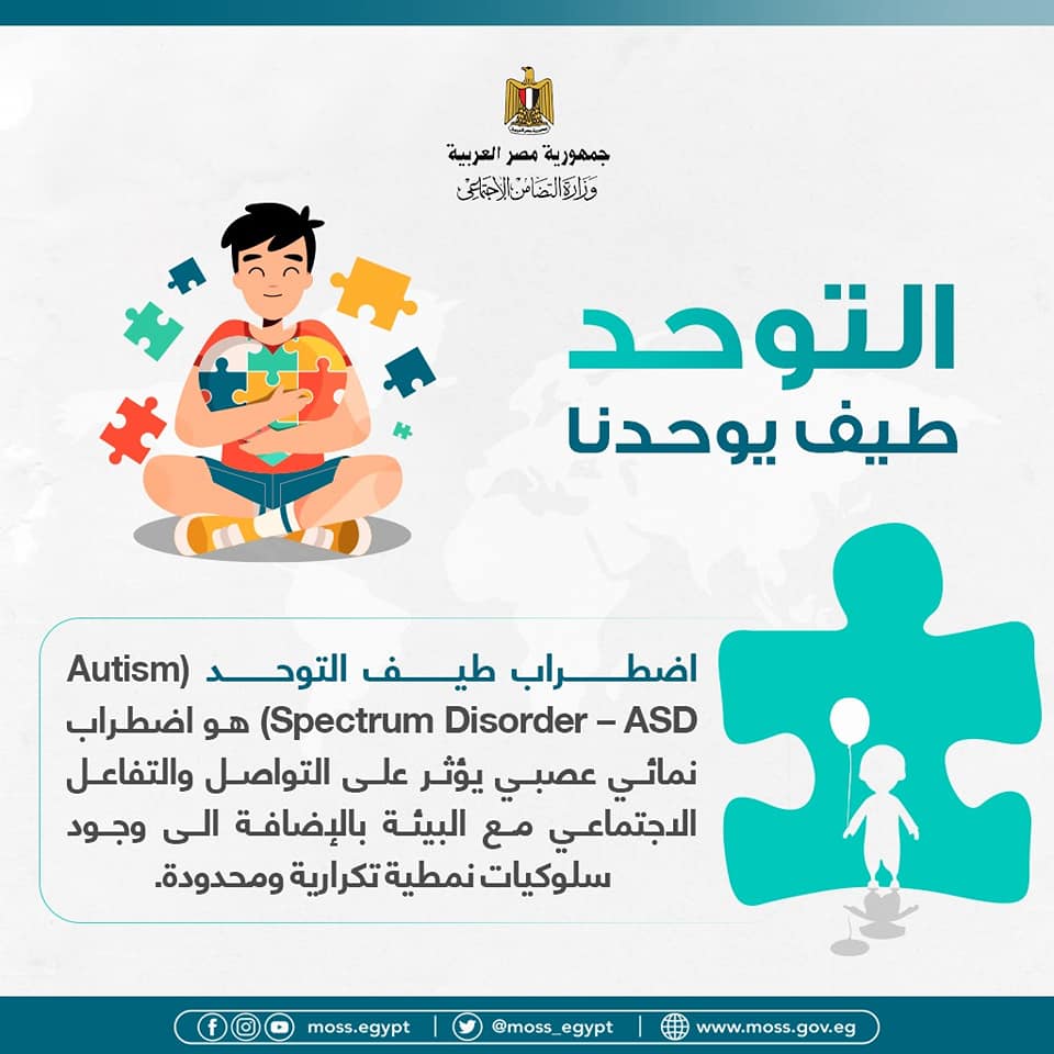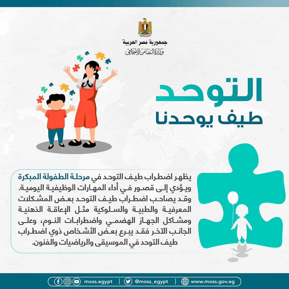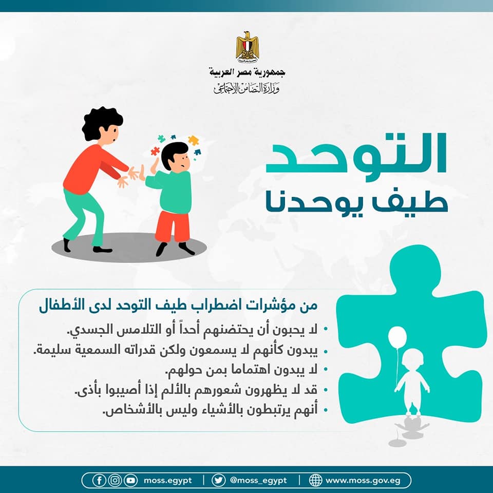 نشرت وزارة التضامن الاجتماعي انفوجراف بمناسبة اليوم العالمي للتوحد يتضمن الإجابة على عدة أسئلة على غرار ماهو طيف التوحد ومتى يبدأ بالظهور عند الأطفال وكيفية التعايش معه.