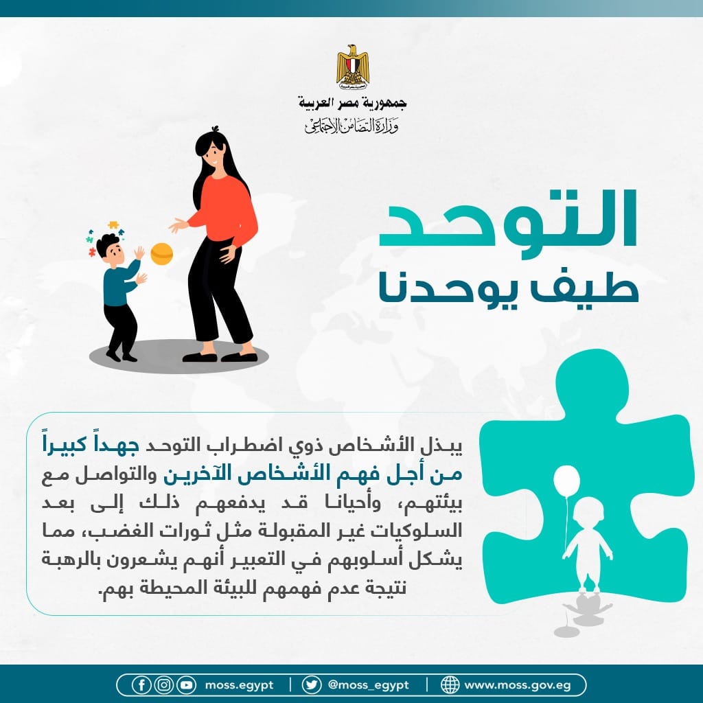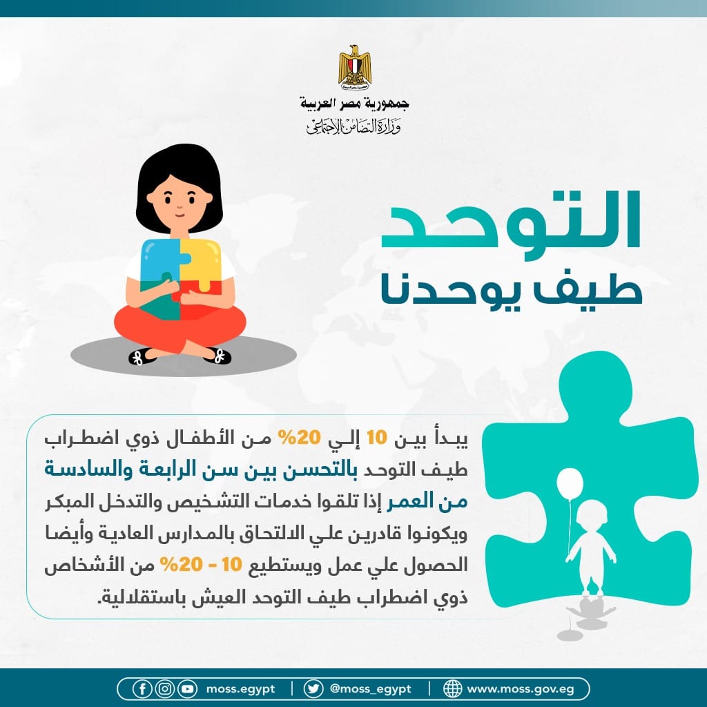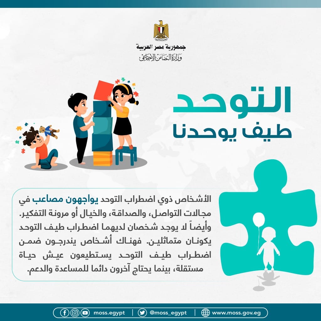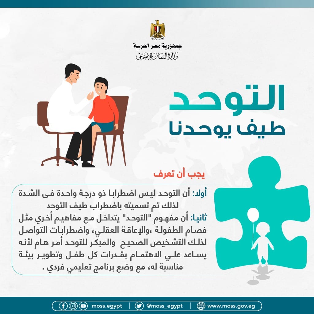 نشرت وزارة التضامن الاجتماعي انفوجراف بمناسبة اليوم العالمي للتوحد يتضمن الإجابة على عدة أسئلة على غرار ماهو طيف التوحد ومتى يبدأ بالظهور عند الأطفال وكيفية التعايش معه.