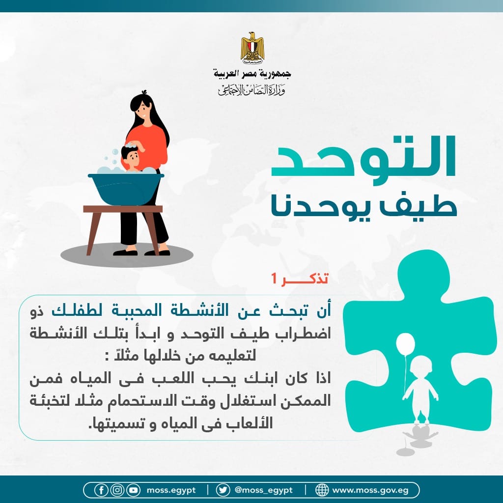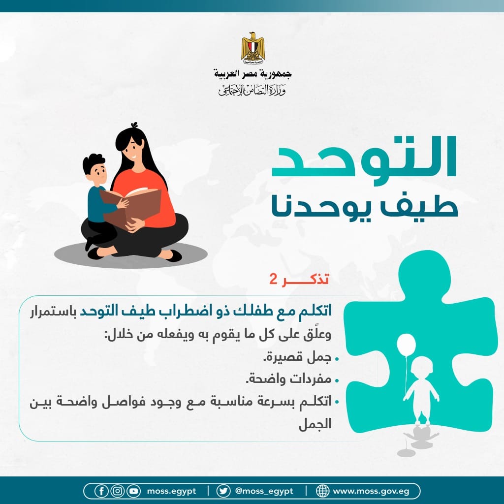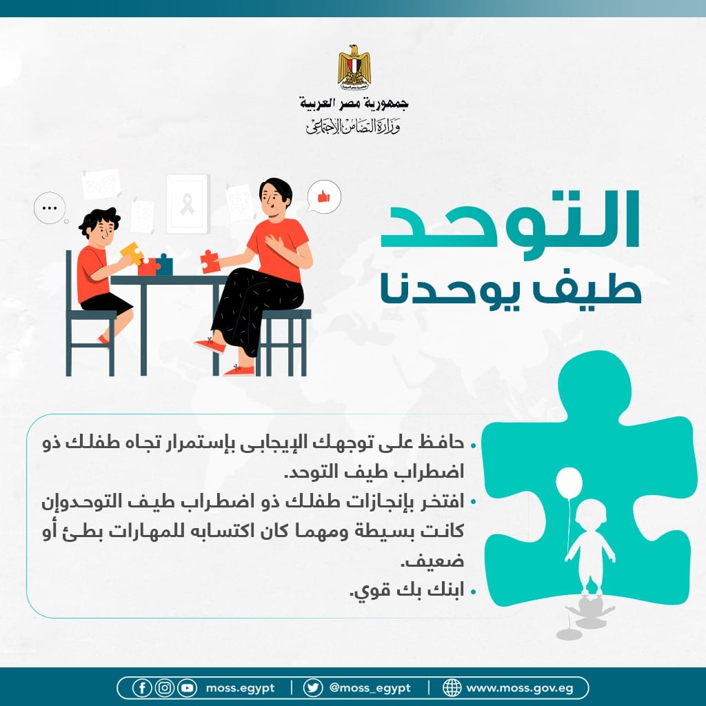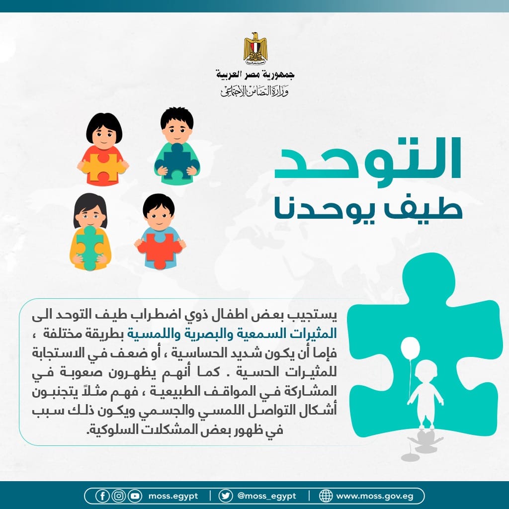 نشرت وزارة التضامن الاجتماعي انفوجراف بمناسبة اليوم العالمي للتوحد يتضمن الإجابة على عدة أسئلة على غرار ماهو طيف التوحد ومتى يبدأ بالظهور عند الأطفال وكيفية التعايش معه.