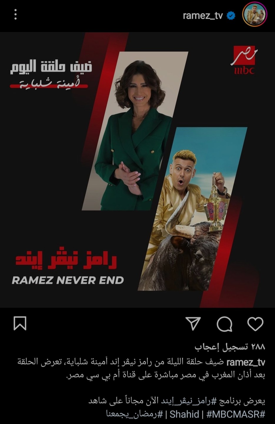 وشارك الفنان رامز جلال مع متابعيه، البوستر الخاص بحلقة الإعلامية أمينة شلباية، وذلك عبر حسابه الرسمي على موقع التواصل الاجتماعي "إنستجرام"، وعلق عليه قائلًا: "ضيف حلقة الليلة من رامز نيفر إند أمينة شلباية، تعرض الحلقة بعد آذان المغرب في مصر مباشرة على قناة إم بي سي مصر".