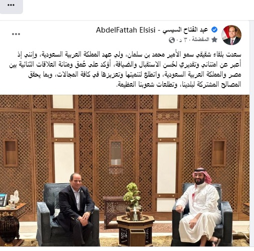 وقال الرئيس السيسى عبر حساباته الرسمية بمواقع التواصل الاجتماعى: "وإنني إذ أعبر عن امتناني وتقديري لحُسن الاستقبال والضيافة، أؤكد على عُمق ومتانة العلاقات الثنائية بين مصر والمملكة العربية السعودية، وأتطلع لتنميتها وتعزيزها في كافة المجالات، وبما يحقق المصالح المشتركة لبلدينا، وتطلعات شعوبنا العظيمة"