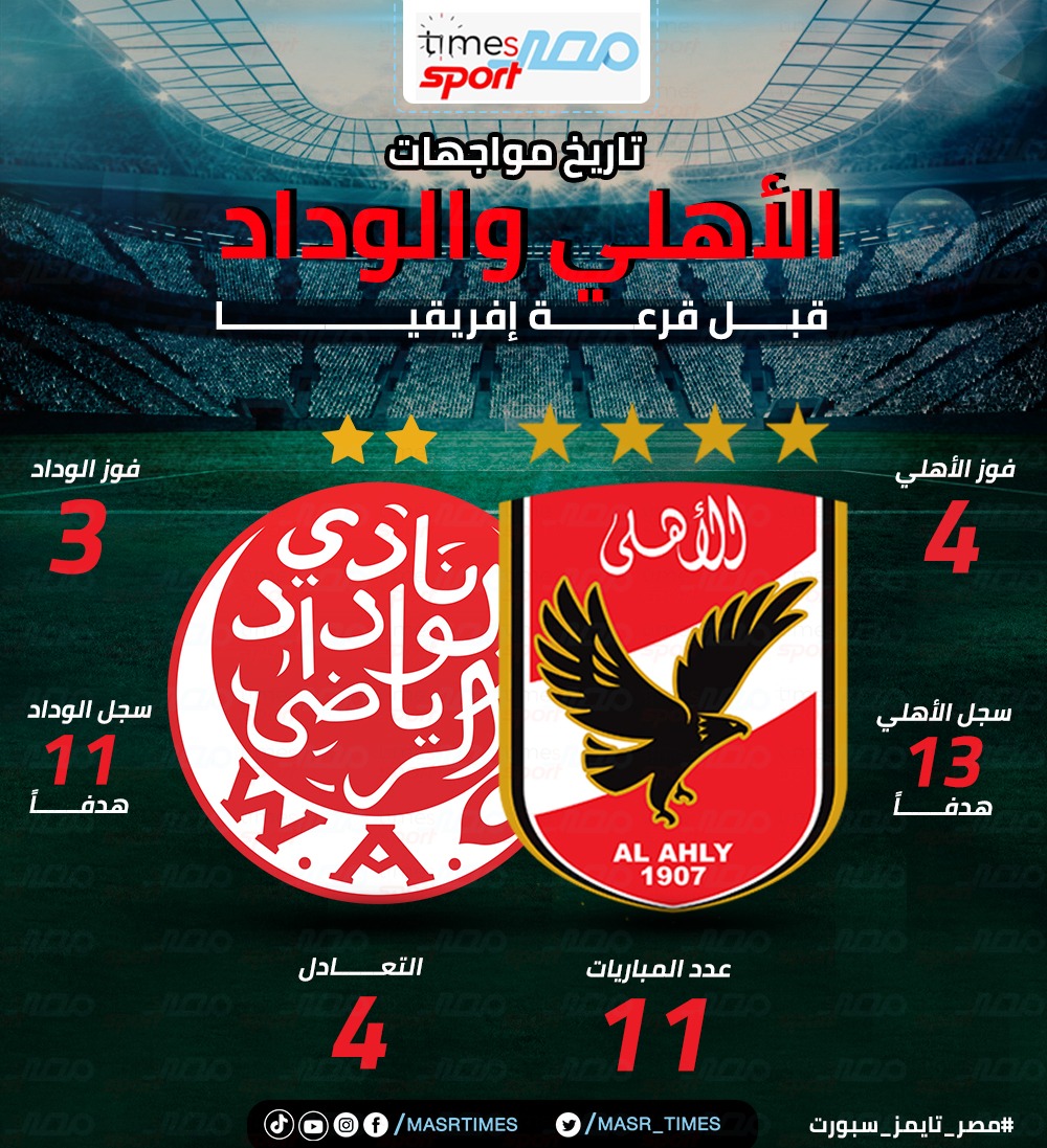 قرعة دوري ابطال افريقيا .. سبق ولعب الأهلي مع الوداد المغربي في 11 مباراة سابقة في بطولة دوري أبطال أفريقيا، وعرف الأهلي الفوز في 4 مباريات، وفاز الوداد في 3 مباريات، وسيطر التعادل على 4 مباريات، ويتفوق الأهلي تهديفياً على نظيره الوداد المغربي في المواجهات المباشرة، حيث سجل الأهلي 13 هدفاً، بينما سجل الوداد المغربي 11 هدفاً.