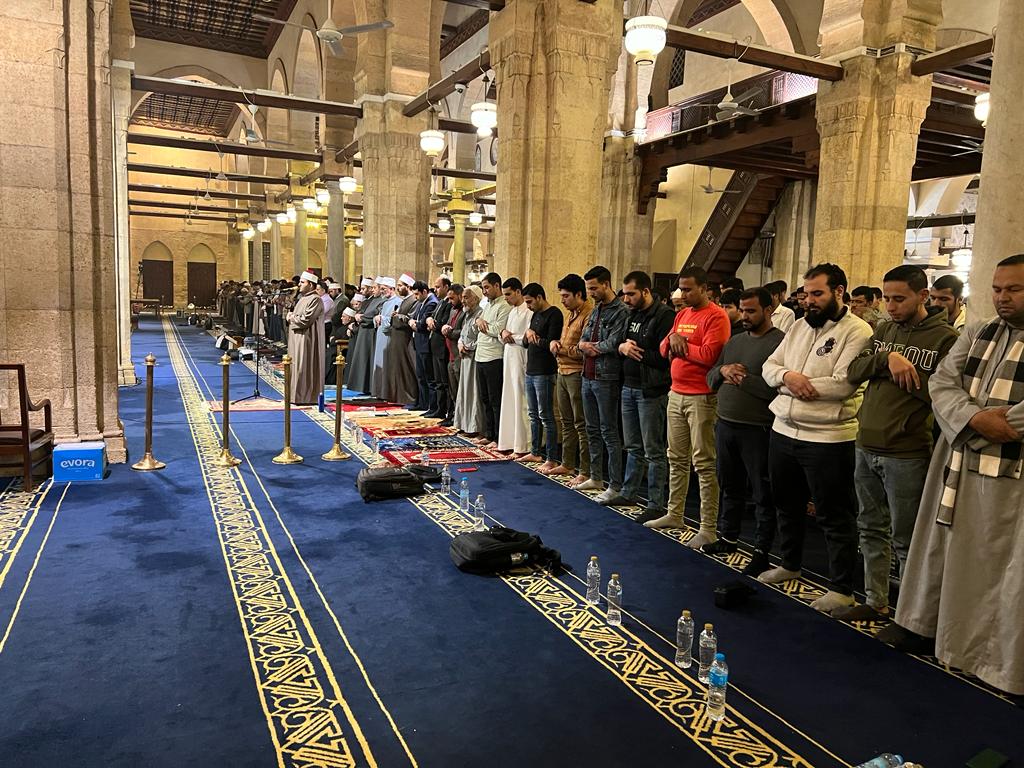 وتقدم المصلين فضيلة الشيخ أيمن عبد الغني، رئيس قطاع المعاهد الأزهرية، والدكتور عبد المنعم فؤاد، المشرف العام على الأروقة العلمية للرواق الأزهري، والدكتور عبد الكريم إبراهيم صالح، رئيس لجنة مراجعة المصحف الشريف، والشيخ حسن عبد النبي، وكيل لجنة مراجعة المصحف، والشيخ سلامة كامل جمعة، عضو لجنة مراجعة المصحف، والدكتور أبو اليزيد سلامة، مدير عام شؤون القرآن الكريم بالأزهر، والدكتور هاني عودة، مدير عام الجامع الأزهر، ونخبة من علماء وقيادات الأزهر، وأقيمت صلاة العشاء من سورة الحجر برواية حفص عن عاصم، وأقيمت صلاة التراويح من سورة النحل برواية ورش عن نافع المدني، ورواية الدوري عن الإمام الكسائي، ورواية رويس عن يعقوب الحضرمي.